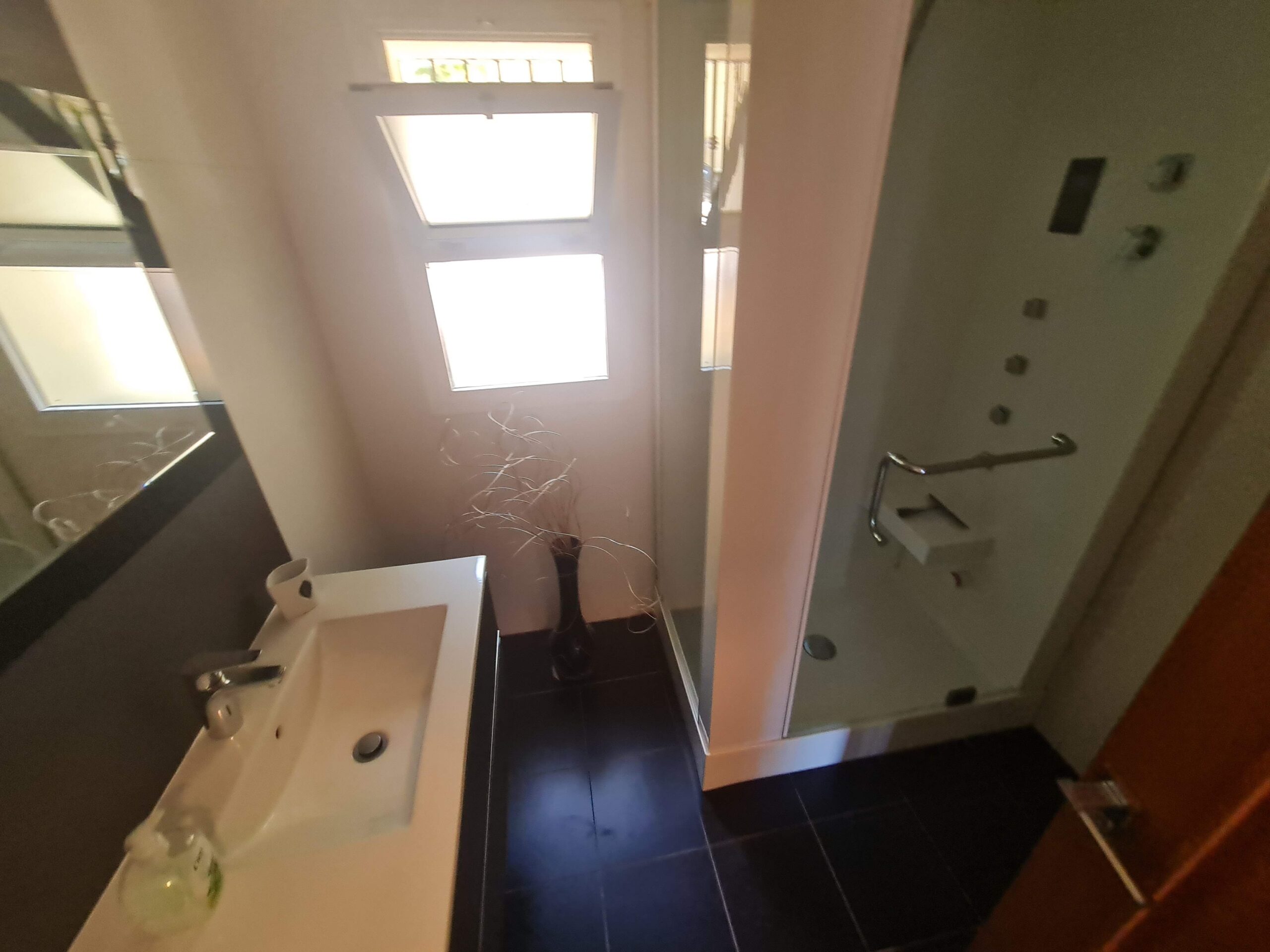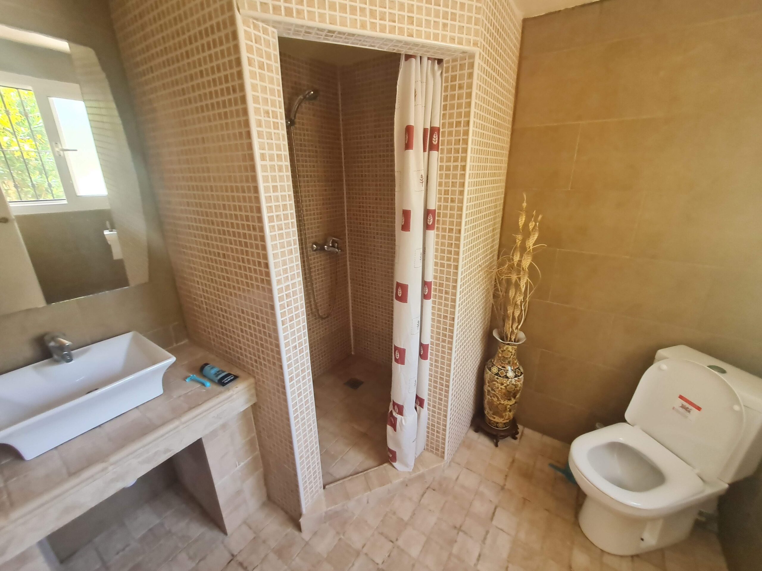 V přízemí se nachází další dvoulůžková ložnice s bezbariérovou koupelnou, otevřená kuchyň, druhá obytná jídelna s přímým vstupem na terasu a bazén. Bazén se nachází na velké terase s další kuchyní, místem pro odpočinek a grilem a je obklopen tropickými stromy. V domě je klimatizace, kombinace dlažby a mramorových podlah.