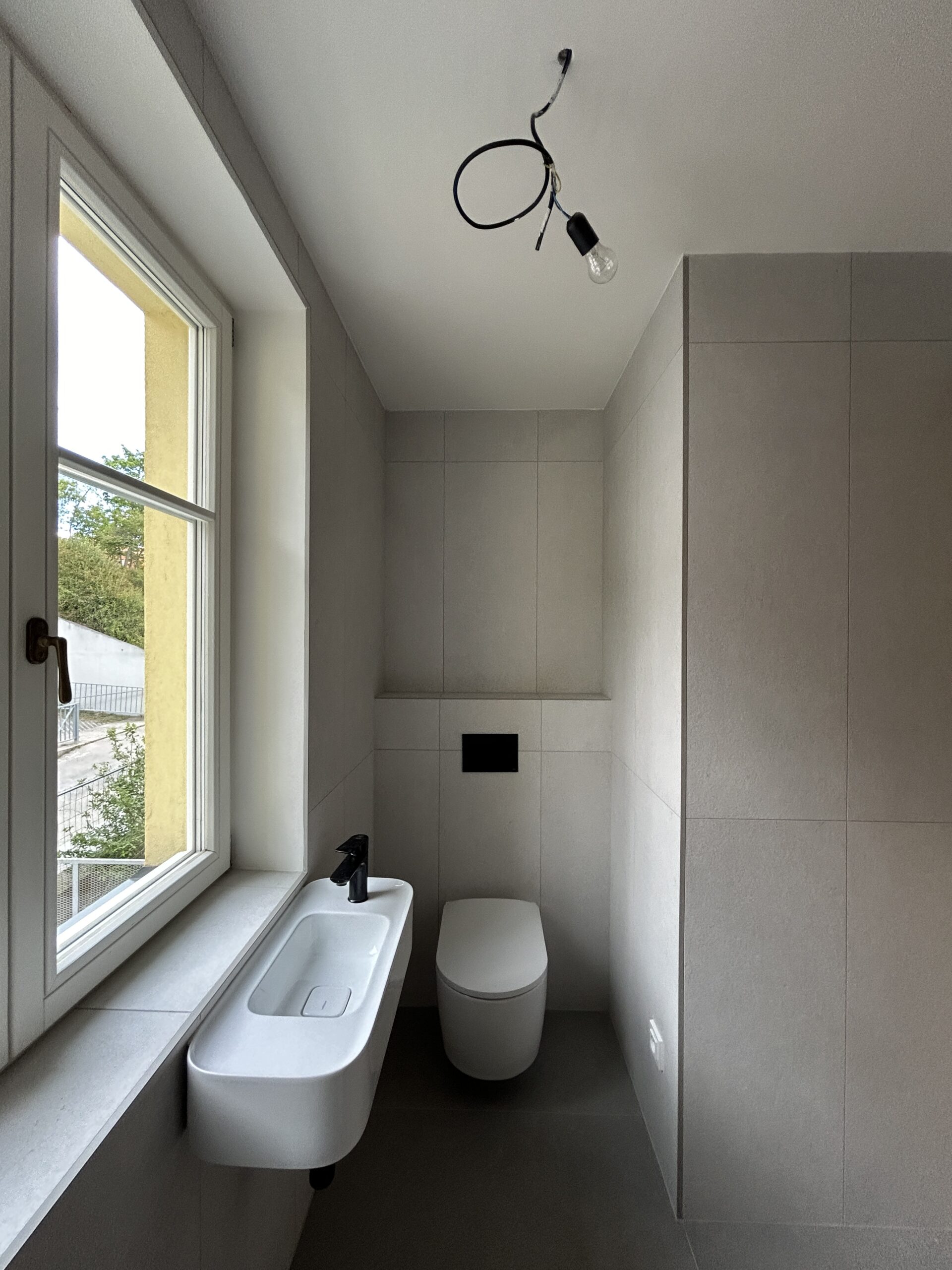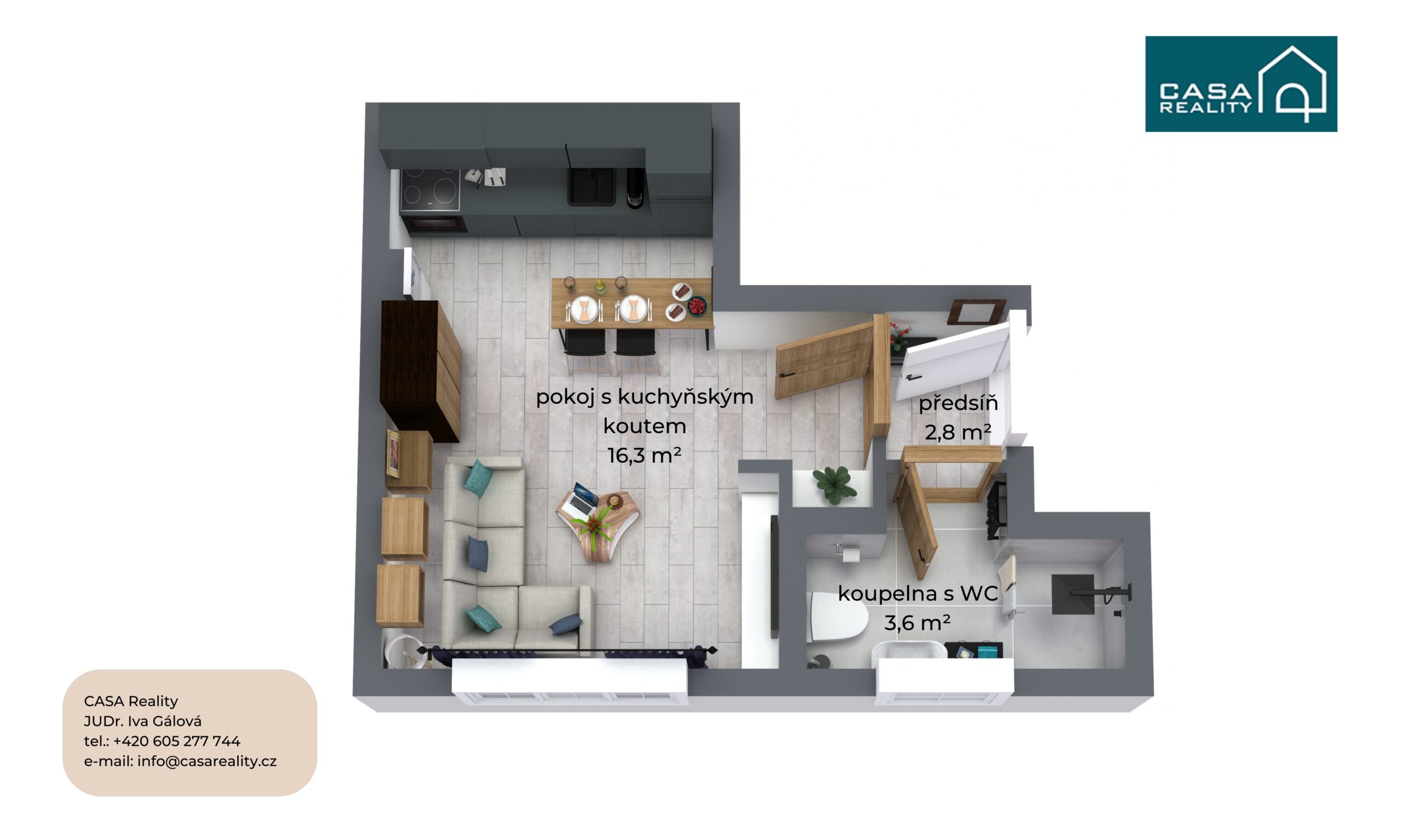 Do bytu se vstupuje menší chodbou. Vlevo se nachází moderní designová koupelna s velkým oknem doplněná sprchovým koutem a WC. Bytu dominuje prostor obývacího pokoje s propojenou kuchyní. Všechny konstrukce jsou provedeny ve vysokém technickém standardu – nová špaletová okna s trojitým zasklením, vinylové podlahy, topná tělesa v pokoji a koupelně, příprava na pračku, dveře se zárubněmi v barvě přírodní dýhy s černými klikami, příprava pro kuchyňskou linku. Součástí vybavení bude stropní osvětlení. Samozřejmostí je kapacitní internet. Vytápění a ohřev vody je zabezpečen plynovým kotlem společným pro všechny nové bytové jednotky. Výhodou jsou nízké náklady na provoz domu, který byl nově zateplen ve vysokém energetickém standardu. Objekt má 9 bytových jednotek, přičemž 5 z nich je zcela nových, 4 jsou stávající.